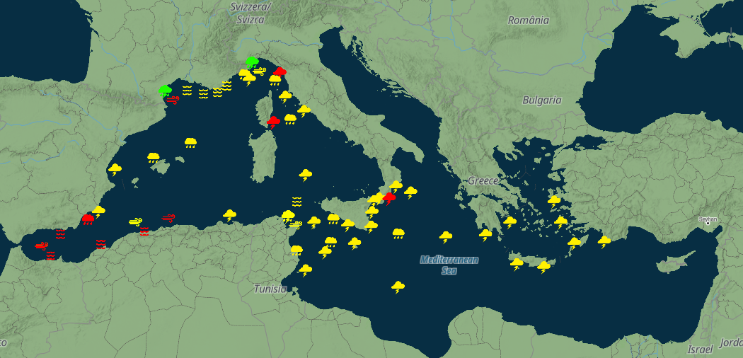 I mari risulteranno mossi o molto mossi nel bacino libico, nel Mare di Sicilia, nei Canali e nel bacino algerino-provenzale. Saranno mossi l'Egeo, il Mare di Cipro, lo Ionio meridionale, il Tirreno, il Ligure e il restante Mediterraneo occidentale. Risulteranno infine poco mossi o localmente mossi i restanti bacini italiani. Il Mare di Alboran risulterà molto mosso o agitato. Saranno molto mossi il bacino libico e lo Ionio, mentre si prevedono mari mossi o molto mossi su Egeo settentrionale, Ligure, Mare di Corsica, Sardegna, Canali, basso Tirreno e Golfo del Leone. Risulteranno, infine, mossi l'alto Adriatico, il medio-alto Tirreno e il Mare delle Baleari. Risulterà agitato il Mare di Alboran, mentre diverranno tendenti a molto mossi il bacino algerino, il Mare delle Baleari e il Golfo del Leone. Si prevedono mari mossi o molto mossi su Ponente ligure, Mare di Corsica, Sardegna, Canali, Ionio, bacino libico ed Egeo. Saranno infine mossi il basso Adriatico, il Levante ligure, il Tirreno e il Mare di Sicilia.
