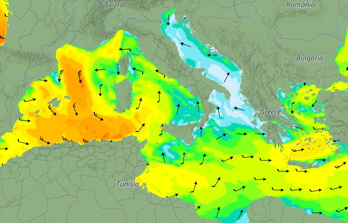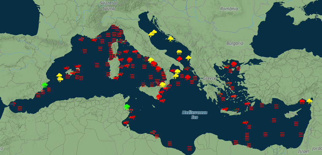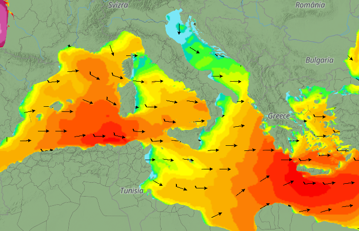 Molto mosso o localmente agitato il mare di Alboran ed il canale di Sicilia; generalmente molto mossi i restanti mari fatta eccezione per l'Adriatico che risulterà calmo o poco mosso. Molto agitato o localmente grosso lungo le coste nord-Africane ed il canale di Sicilia; molto mossi i restanti bacini occidentali; molto mosso lo Ionio con tendenza a divenire agitato; mosso l'Egeo. Molto agitato o grosso il canale di Sicilia ed il golfo della Sirte; mossi i bacini occidentali; mosso con tendenza a divenire molto mosso prima ed agitato in serata l'Egeo.